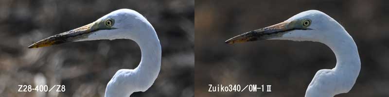 下の画像は共に800x1600ピクセルにトリミングしたものである。Z8の方は4600万画素で400mm、OM-1の方は2000万画素で換算600mmであるから、偶然ほぼおなじ大きさとなった。28-400の開放はF8で340のそれはF4であるのが背景のボケ具合で察することができる。今までボケの差を気にしたことはなかったが、これほど違うと考慮しなければならないだろう。