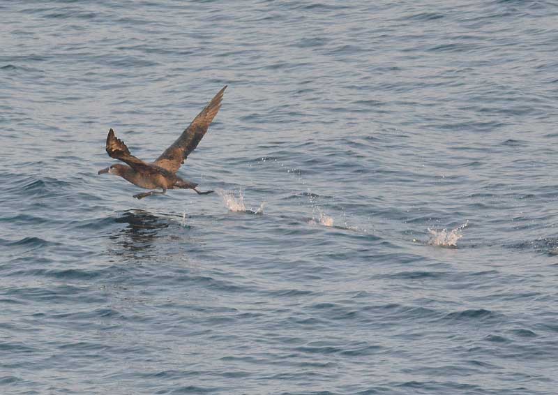 探鳥記 ◆2017-4-8 (三宅島周辺) 今回の八丈島クルーズでの第一目標はアホウドリであったが、距離が近くまともな写真が撮れたのは一回だけだった。それに比べると、このクロアシアホウドリは数倍の頻度で出現した。それもかなり近くに。 ◆2013-6-20 岩手県沖 マイカーで北海道へ行くため、大洗→苫小牧フェリーに乗船。朝4時に起き、なめるように海上を見回しながら、苫小牧に着く13時頃まで探鳥した。これは探鳥開始後まもなく撮影したもの。曇りで薄い霧がかかっていたため画質は悪い。 海鳥、とくにミズナギドリ類の識別はとても難しいが、この個体の特徴(嘴基部周辺と眼の下部のみ白い、初列風切の羽軸は白い)はよくクロアシアホウドリのそれらと合致する。 また、体が大きく重たいアホウドリは、飛び立つときに他のミズナギドリより水面を多くたたいて助走しなければならない。その特徴も顕著に見られた。 | |