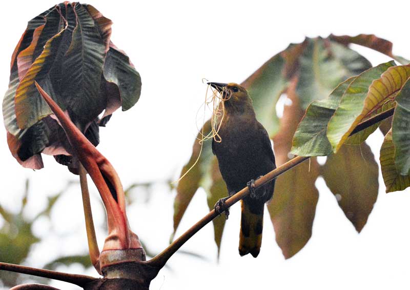 探鳥記 ◆2013-4-30 このオロペンドーラは暗いうちからせっせと巣造りしていた。ヤシの葉の筋を切り取っては巣に運んでいた。その巣はまだ半分程度しかできていないが、この周辺にはおおよそ10程度の完成した巣が高い木の枝からぶら下がっている。まさにオオツリスドリの名にふさわしい。 また高い木のてっぺんにとまって、一度聞けば決して忘れないほど特徴的で大きな声で間歇的にさえずっていた。さえずりの最後には羽を大きく広げでは閉じていた。 | |